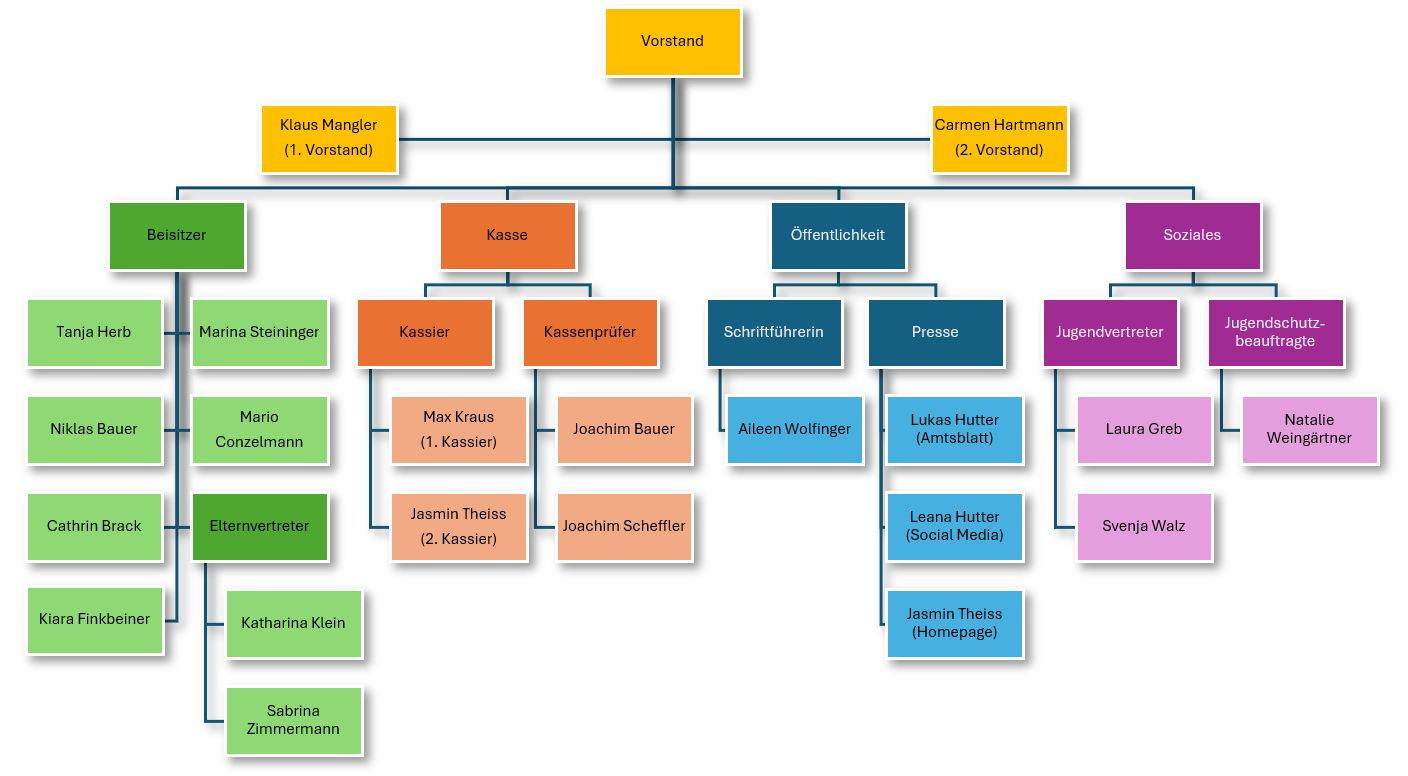 Hinten: Mario Conzelmann (Beisitzer), Niklas Bauer (Beisitzer), Klaus Mangler (1. Vorstand), Klaus Hutter, Cathrin Brack (Instrumentenwartin), Carmen Hartmann (2. Vorständin), Sabrina Zimmermann (Elternvertreterin), Marina Steiniger (Beisitzerin), Katharina Klein (Elternvertreterin), Joachim Bauer (Kassenprüfer), Natalie Weingärtner (Jugendschutzbeauftragte), Jasmin Theiss (2. Kassierin), Tanja Herb (Beisitzerin), Joachim Scheffler (Kassenprüfer)