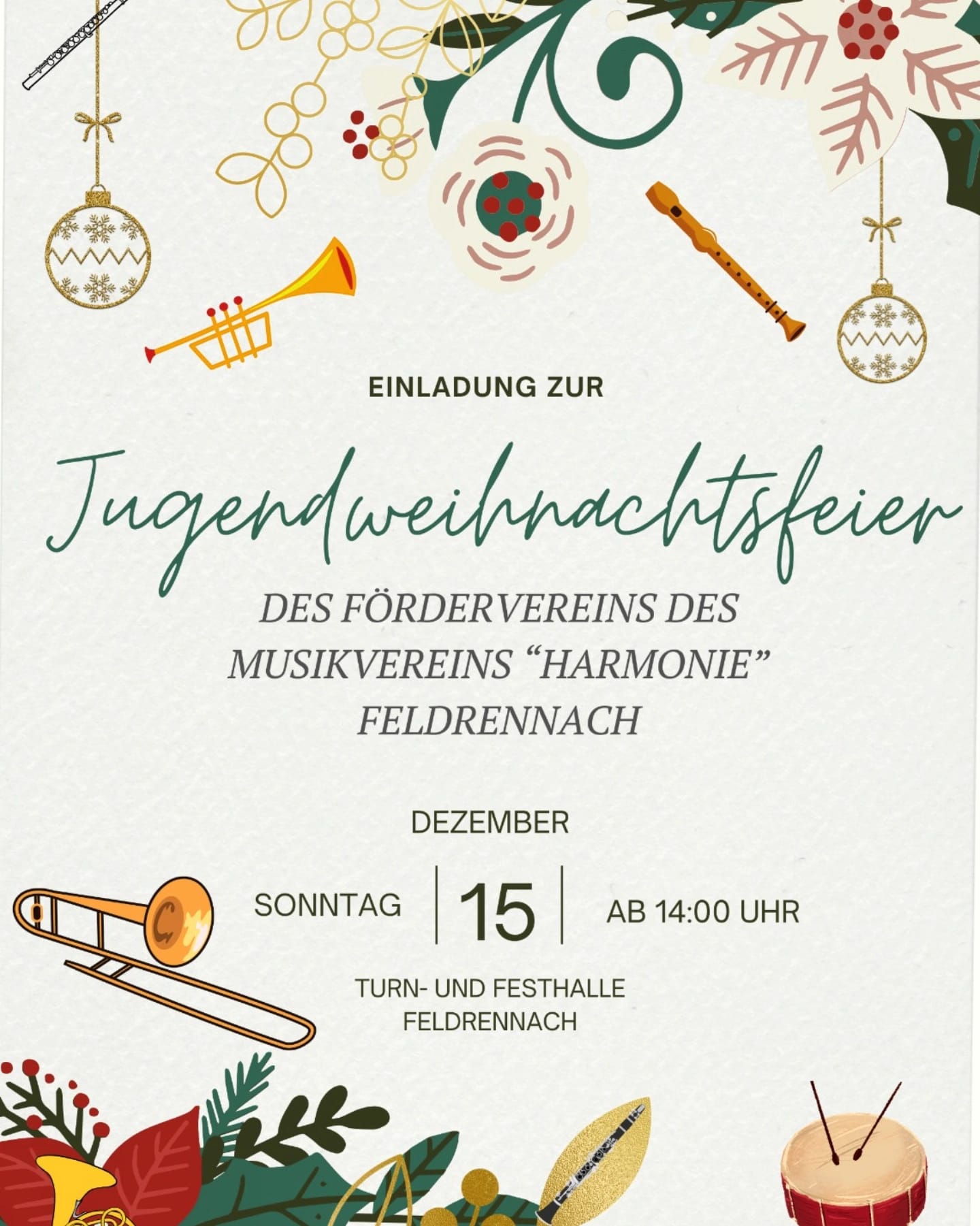 Der Förderverein des Musikvereins „Harmonie“ Feldrennach e.V. lädt alle Jungmusiker*innen, Eltern, Freunde und Verwandte sowie alle Freunde und Gönner des Fördervereins zur diesjährigen Jugendweihnachtsfeier am Sonntag, den 15.12.24, ab 14:00h in die Turn- und Festhalle Feldrennach ein. Es erwartet Sie und Euch ein buntes musikalisches Programm, das bereits fleißig vorbereitet wird. Neben Kaffee und Kuchen bietet die beliebte MV-Küche weitere Köstlichkeiten. Auf Euer und Ihr Kommen freut sich Der Förderverein des Musikvereins „Harmonie“ Feldrennach.